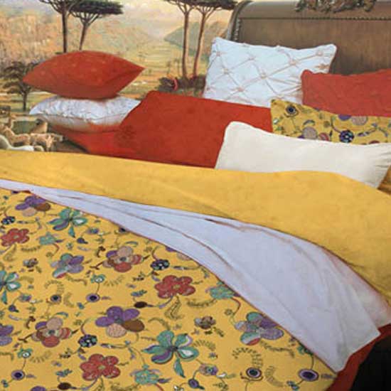 The bed linen set includes quilts, bed covers and pillowcases. The set is well adorned with colorful flowers with a yellow background. Create an artistic bedroom in a modern house with this bed linen set.