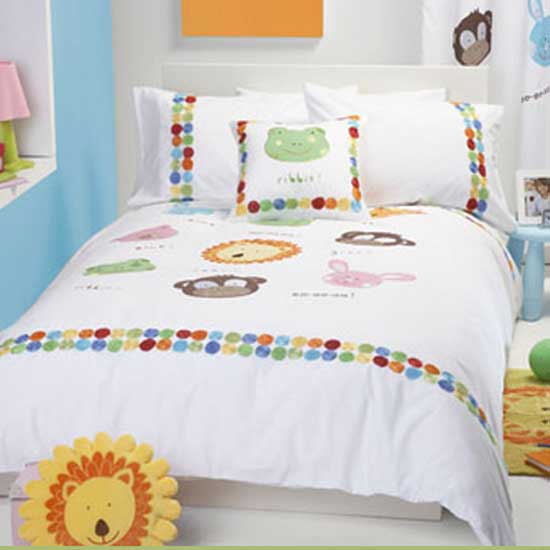 The bedding set includes pillows and a blanket. They feature a colorful animal theme that is ideal for a kids' room. These bedding items are hand-stitched with delicate workmanship.