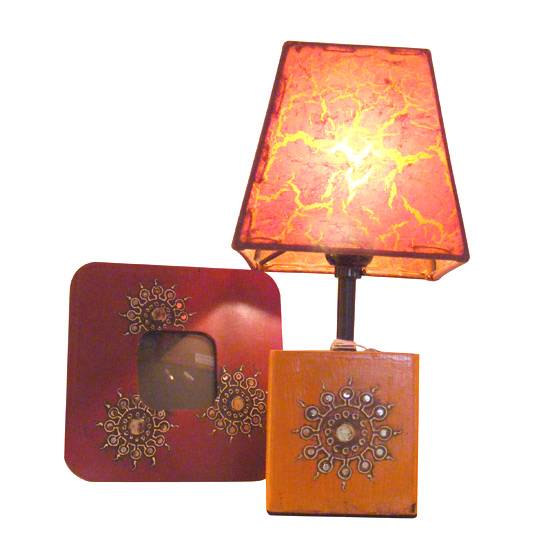 This is an Indian style bedside lamp. The indian style gives it an exotic feature. The lamp has a leather shade with cracked pattern in red and bronze. The light emits through it is soft and mild. The base is made of wood with Indian style embellishment.