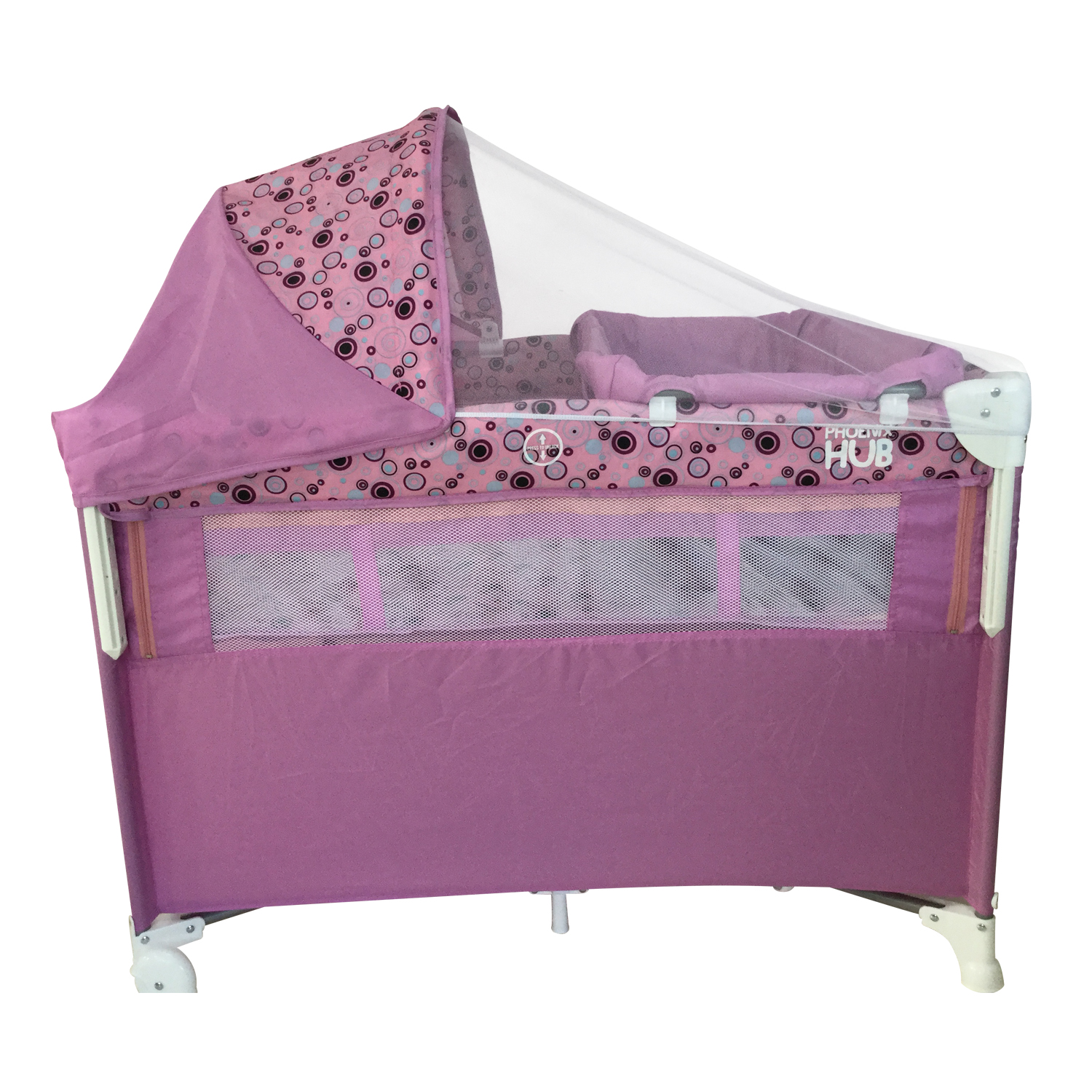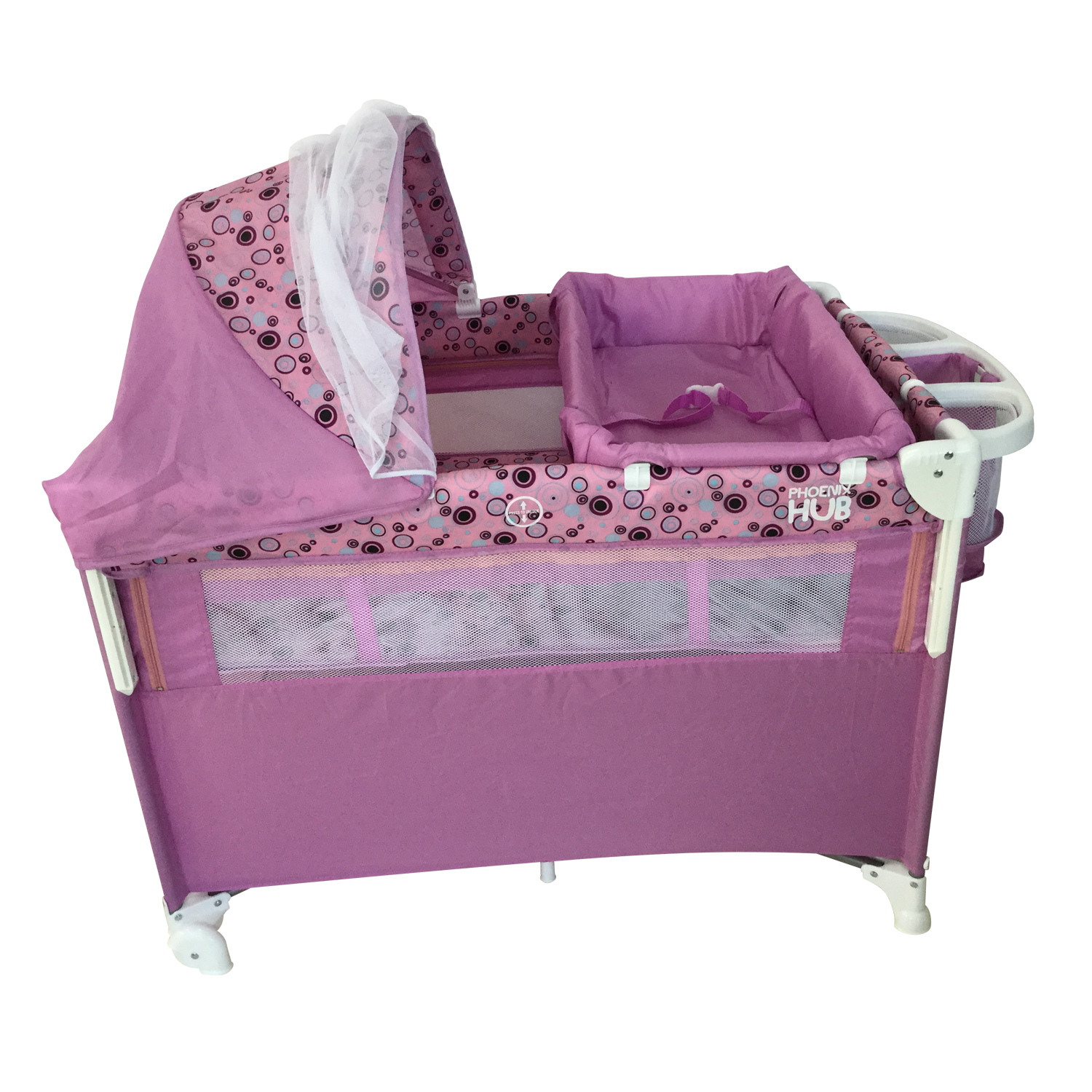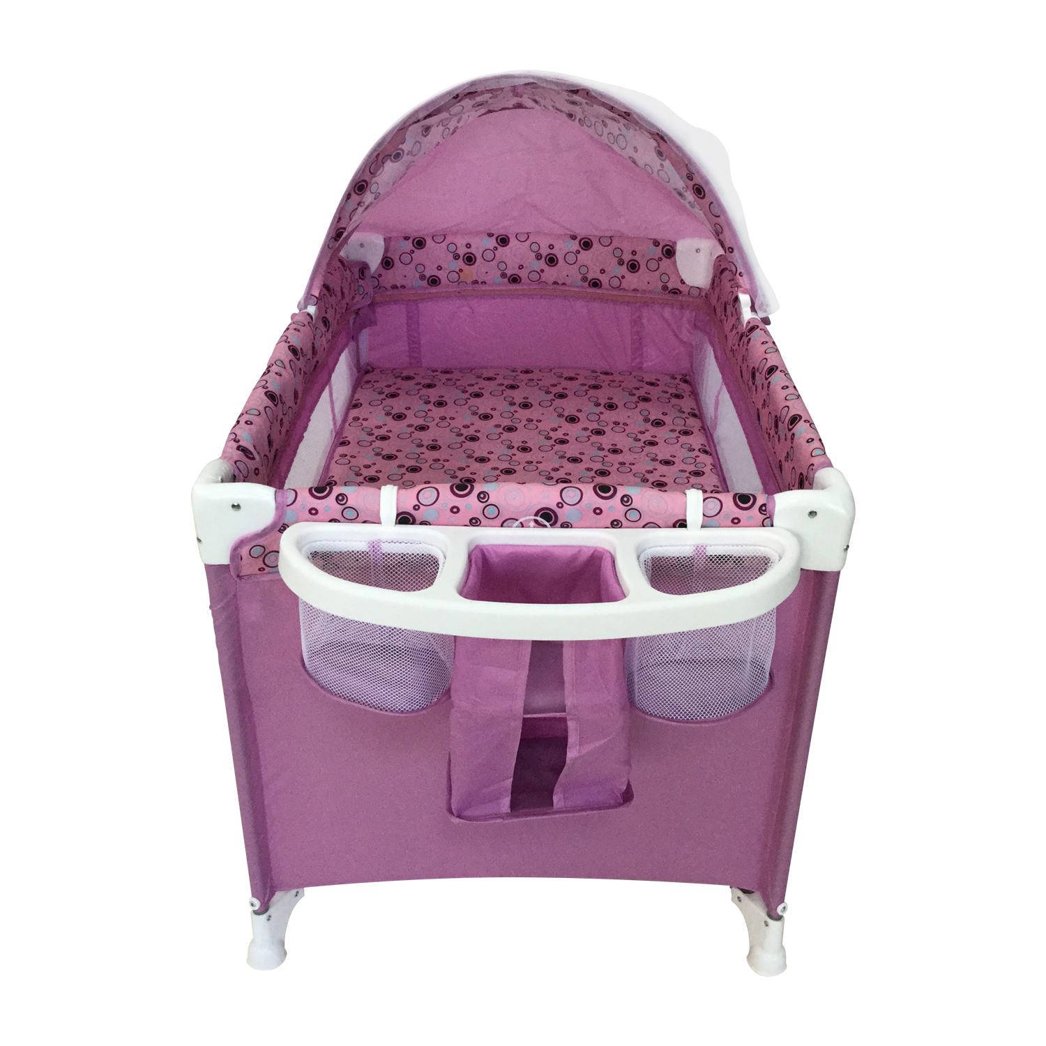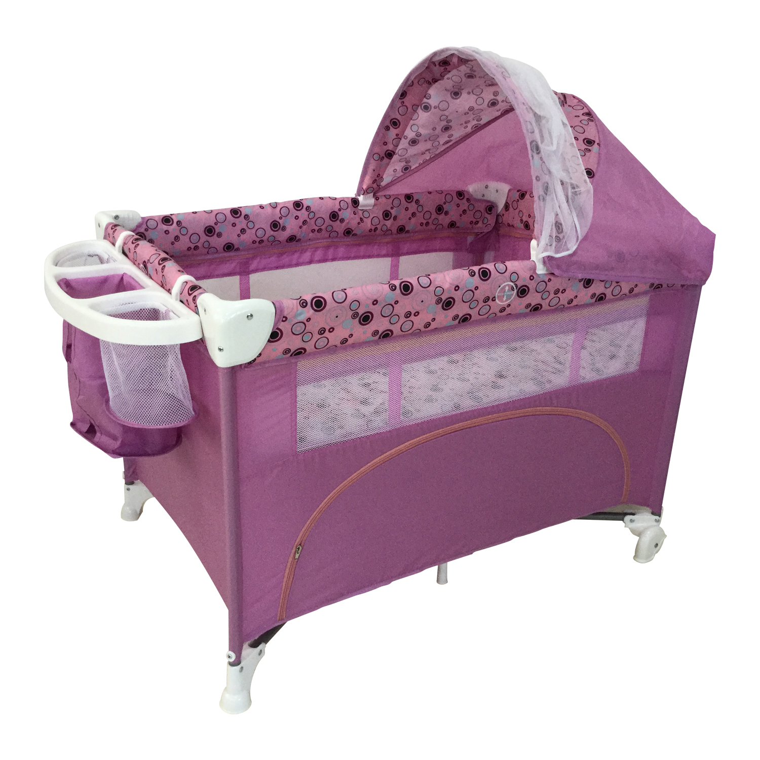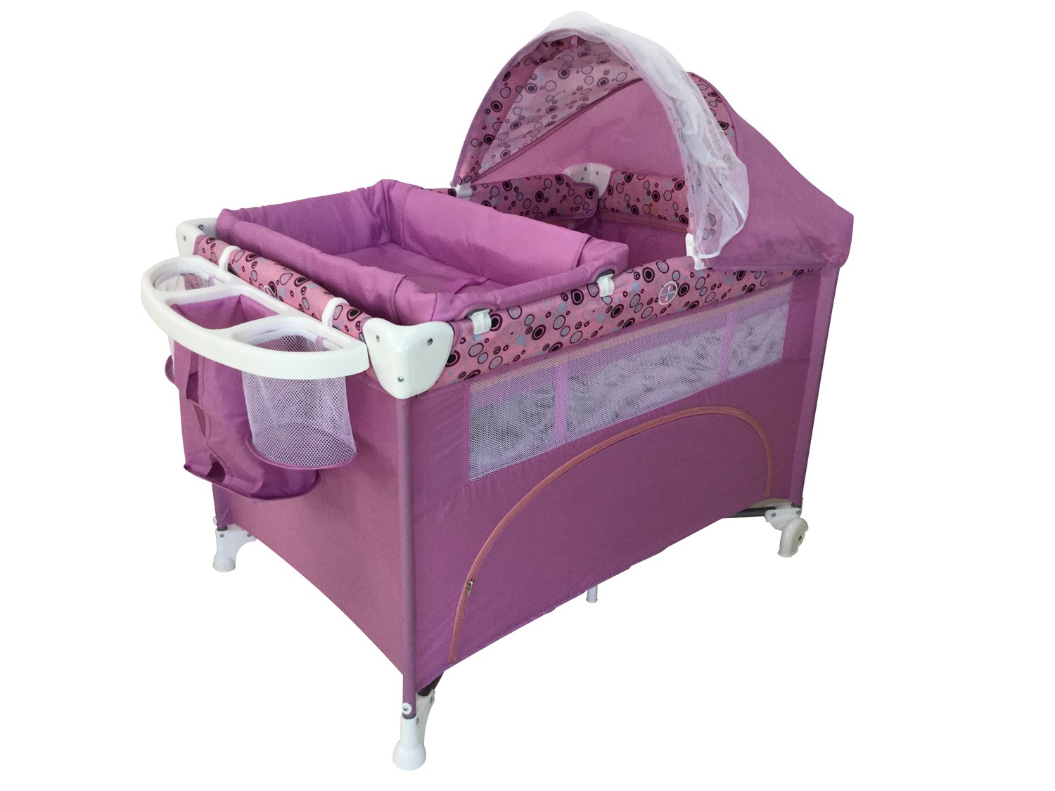- Canopy with mosquito net; diaper changer
