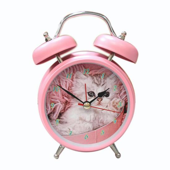 This is a bell alarm clock for bedsides and desks. It boasts a stylish dial with Arabic hour markers and slender hands. The kitten print adds a touch of style to the clock. This alarm clock surely is a great item to accent your room.