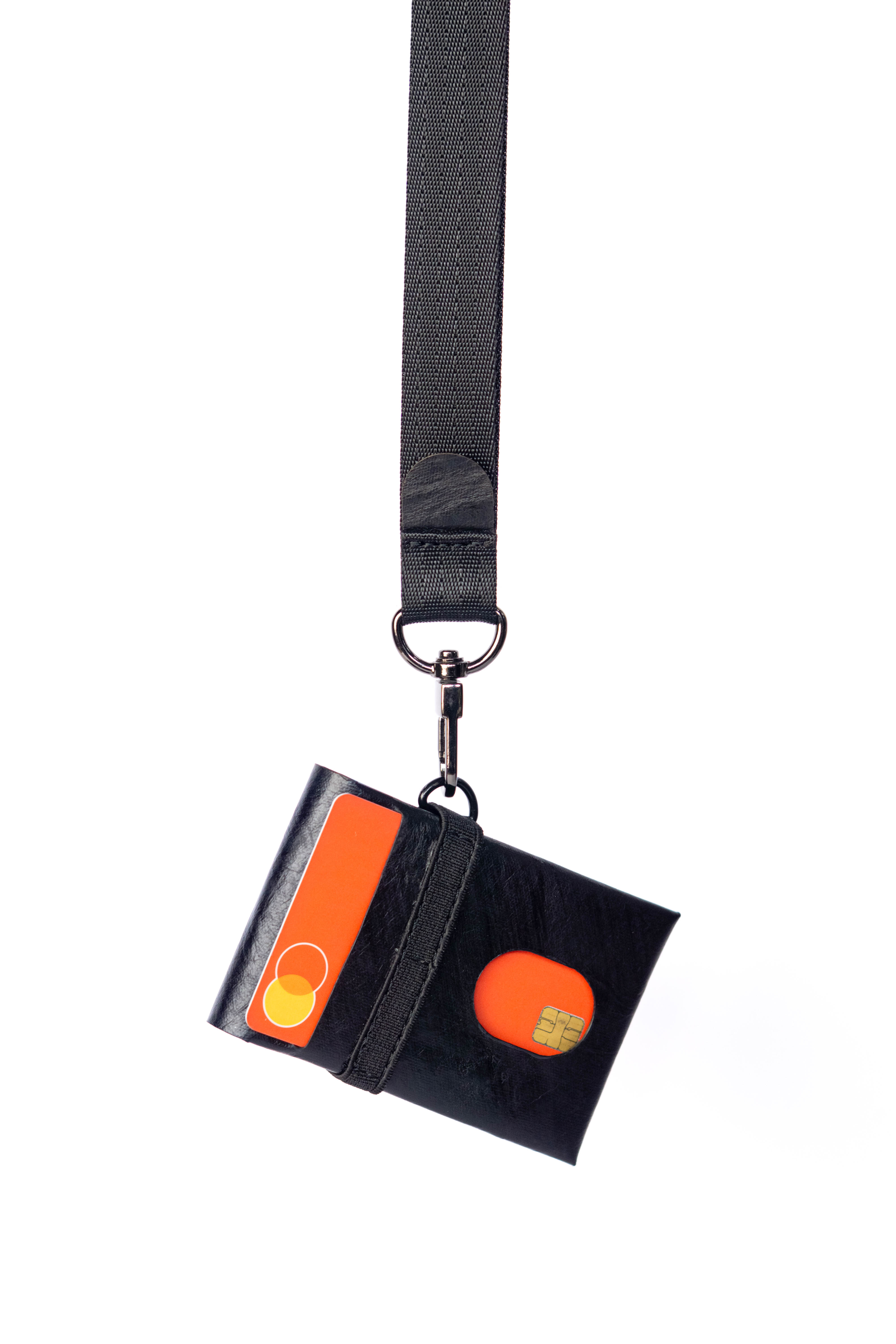 secures the folds, while a built-in D-ring allows the wallet to be attached to a lanyard for easy