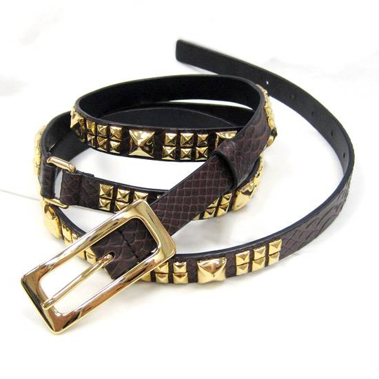 This is a brown coloured belt made of imitation leather. The belt is decorated with square shaped golden beads.
