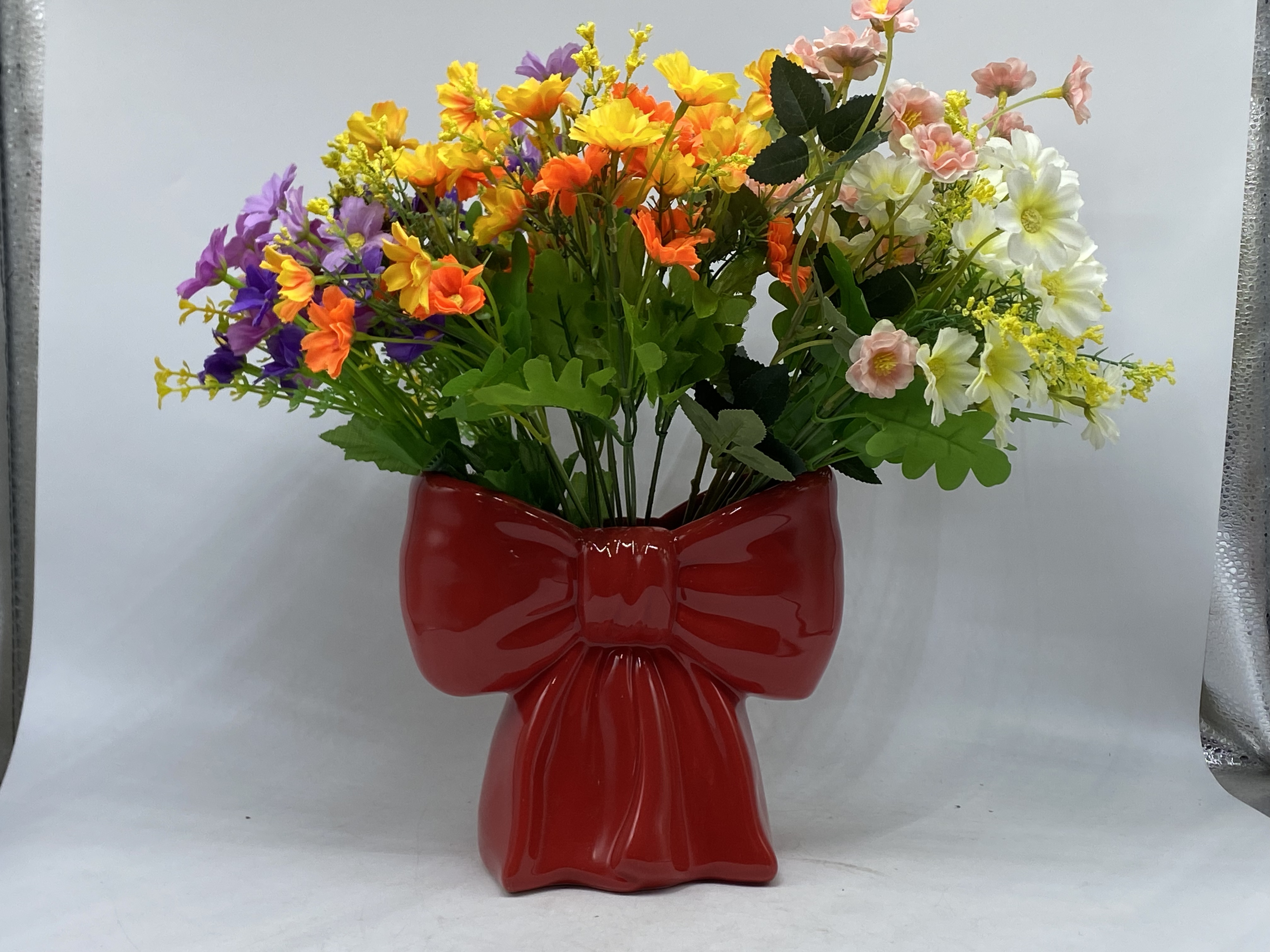 This is a flower arrangement ceramic vase with a bow shape, made of kaolin, adopting overall color elements, which is beautiful and elegant.