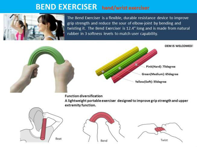 • The Bend Exerciser is 12.4" long and is made from natural rubber in 3 softness levels to match user capability.