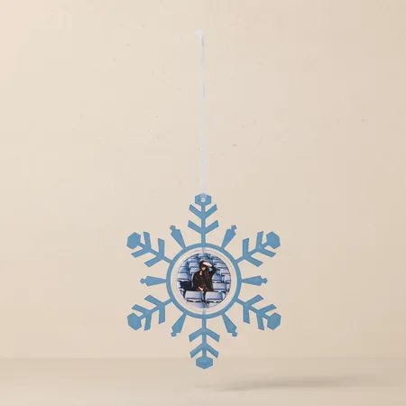 Snowflake shaped photo frame ornament that is ideal for displaying photo and decorating Christmas tree or any wall space. Fits two petite photos.