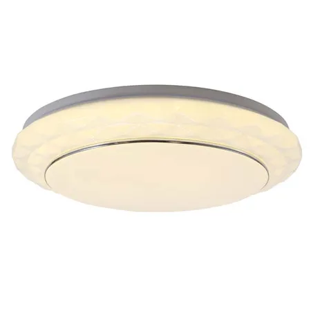 This is a circular ceiling light. It has a light gray frame. The outer layer of the lampshade features a design similar to diamond patterns. When lit, it emits a soft warm light. The middle part of the lampshade is flat and smooth. The overall shape is simple yet exquisite, and it can add a warm atmosphere to the home environment.