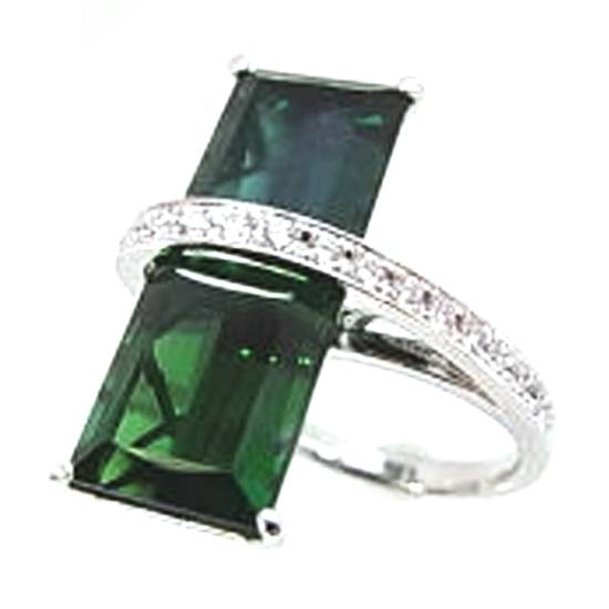 This is a bi-color tourmaline ring. The tourmaline ring has a futuristic design of holding the rectangular tourmaline. When the ring is worn, the center stone appears between the two fingers, presenting a new aspect and approach to rectangular shape stone in ring making.