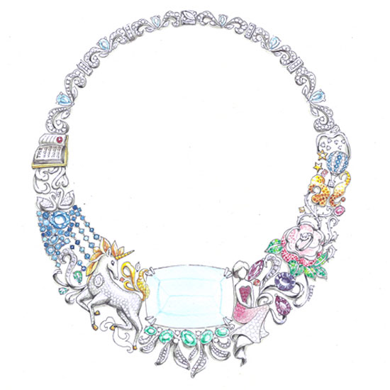 This bib necklace features a fancy design with animal and floral embellishments in various colors. A clear sparkling stone in the center draws attention to the wearer. This beautiful jewelry blends fantasy and elegance into one.