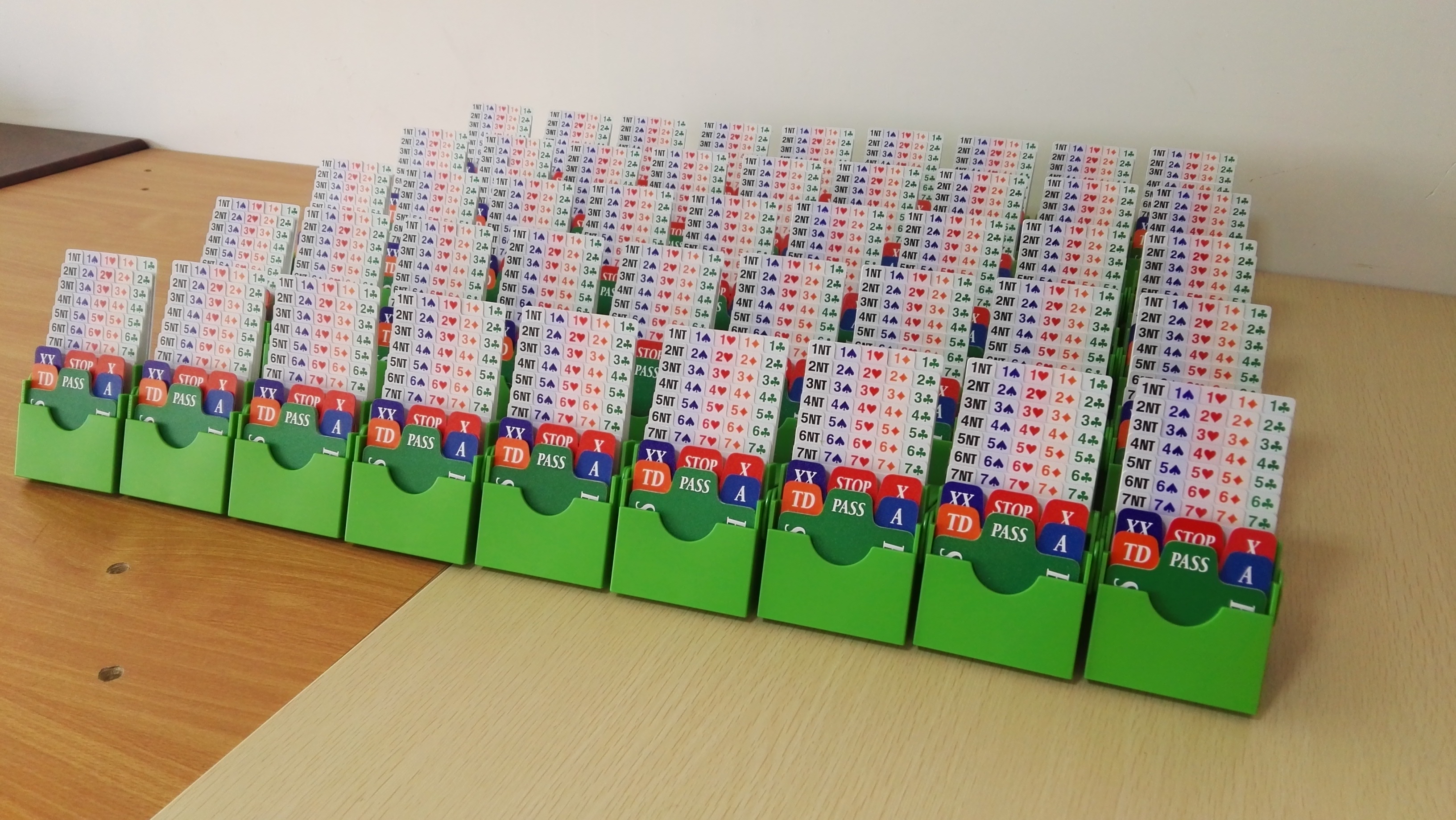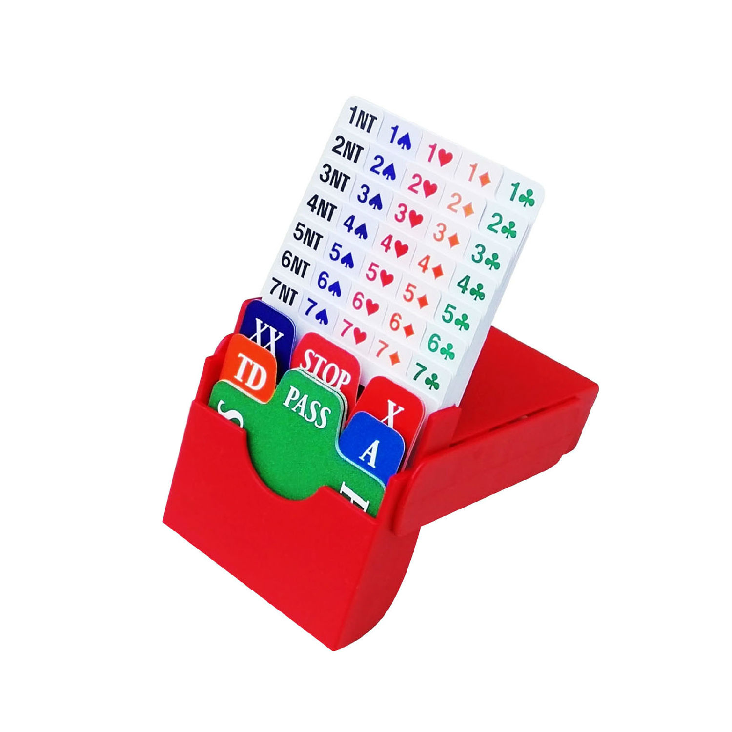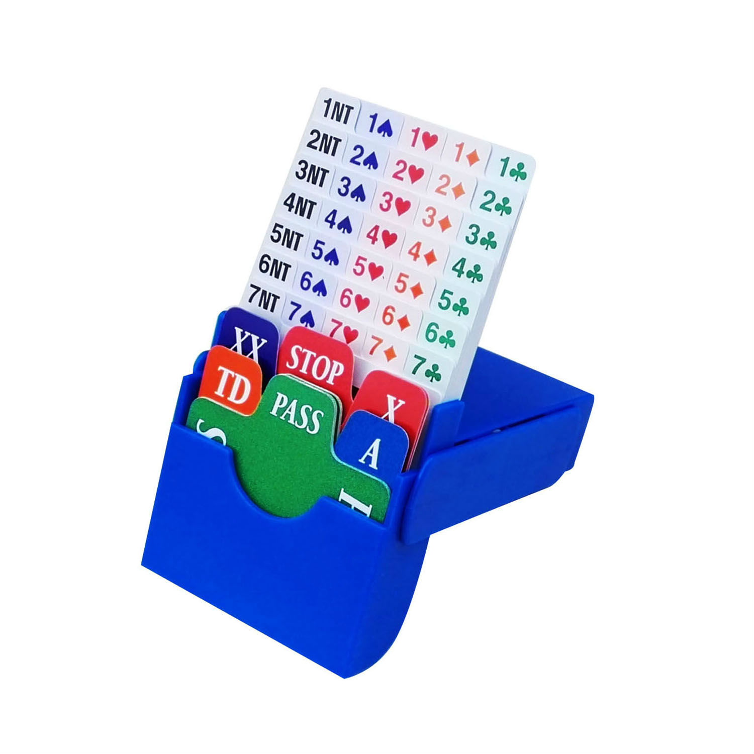 Now Plastic insert cards are more and more popular due to its durability and comfort during bridge playing.It is also washable and water proof,it enables you to wash them when cards are splashed by coffee or tea or something else.Most bridge clubs use bidding boxes filled with cards designating every possible call.The cards provide an instant review of the bidding and eliminate the possibility of mishearing an auction.