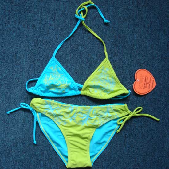 The showcased bikini swimwear features a halter-neck top with a string-tie bottom. It comes with a teal and turquoise color palette to create a funky summer accent. This bikini swimwear is an appealing piece to wear on a sunny-side beach.