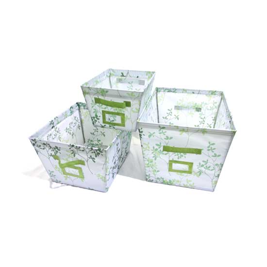This white polyester bin features leaf and brand prints on its surface. The well-constructed piece can be used for a long time. The bin is available in 3 different sizes.