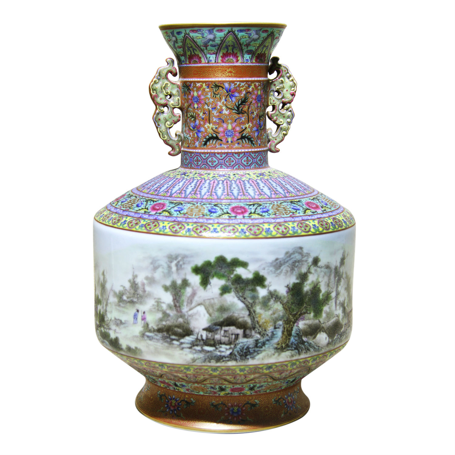 - Drawings on the vase accentuating poetic Asian natural scenery. (Dingxuan shanshui).