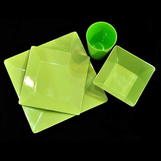 This bio-bamboo dinner set includes two plates, a bowl and a cup. The plates and cups are in square styles for a special touch. They come in different sizes for various needs. Add these green products to your kitchen.