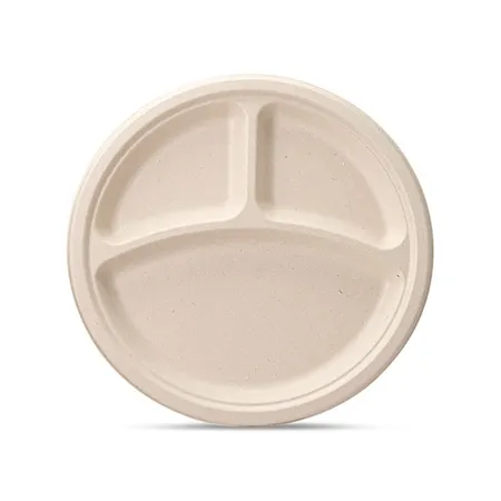 Serve meals with sustainability in mind using this 9-Inch Disposable 3-Compartment Plate, crafted from eco-friendly bamboo fiber. Ideal for picnics, parties, catering, and everyday use, this plate offers a sturdy, biodegradable alternative to traditional plastic or paper dinnerware. The three compartments make it easy to portion food and keep flavors separate.