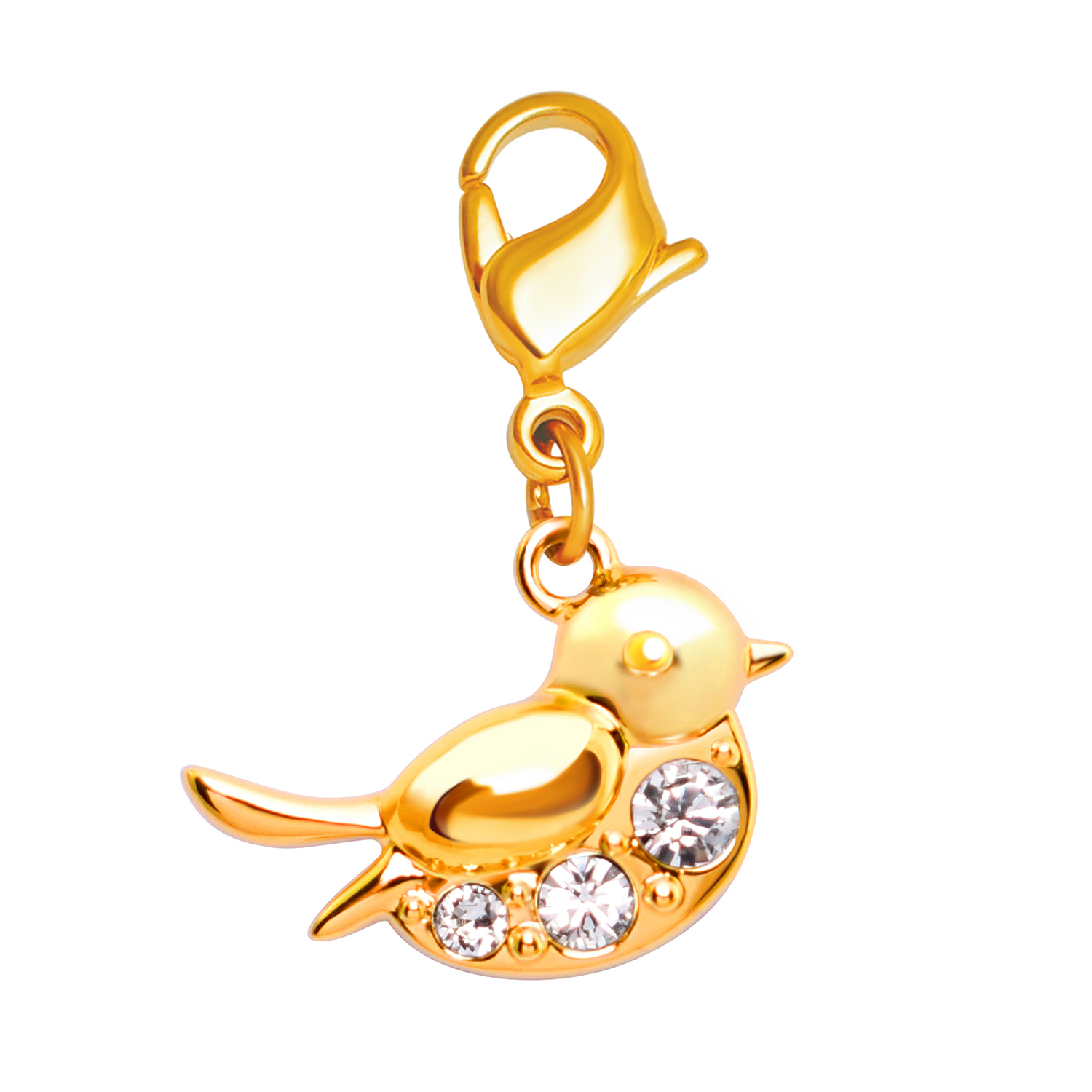 Add this cute and lovely gold-plated bird charm to your charm bracelet. This charm comes in the design of a bird with three sparkling stones embellished on its body. Dangling down from your bracelet, it guarantees to look lively and dynamic when you slightly move your waist. Lovely and dainty, this bird charm would make a great addition to your charm bracelet.