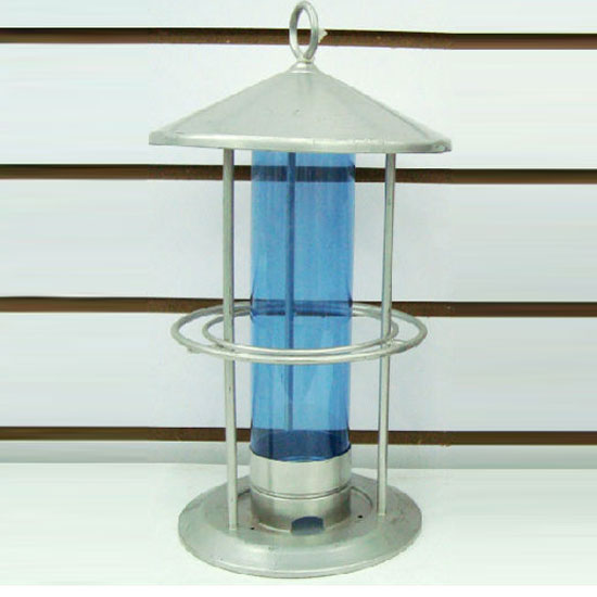 Presented is a sturdy feeder designed for your beloved bird. This piece exhibits a rugged metallic appearance. It is fitted with a loop on top for hanging.