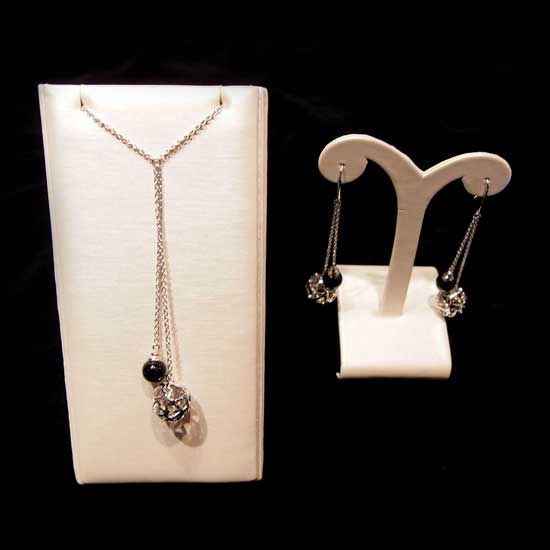 This black agate jewelry set includes a pair of earrings and a necklace. The items feature a classical drop design which will never go out of style. Next to the plump agates there are round embellishments with romantic heart-shaped cutouts.