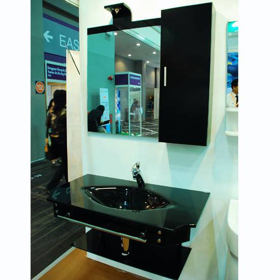 This basin with a cabinet is black in color for a modern and mysterious feeling. The glass oval-shaped basin stands out from the rectangular mirror, cabinet and shelf for a super-cool look. The basin with a cabinet is suitable for household use.