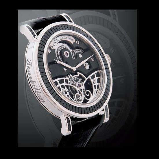Presented is a beautiful timepiece crafted with precision. The watch features a white gold case and black diamond baguettes set on the bezel. The bridge of tourbillon is made of enamel as a perfect remark.