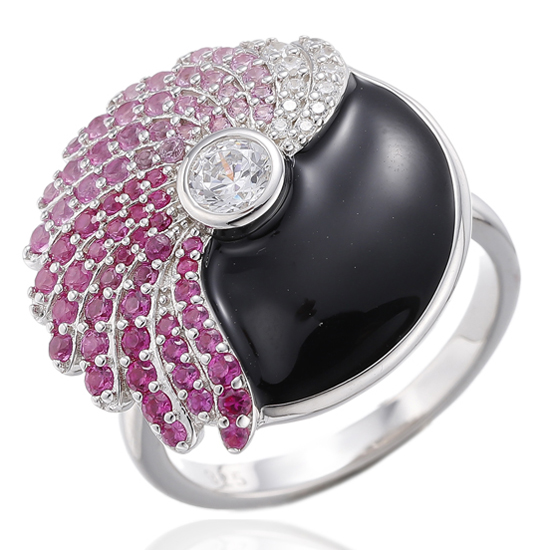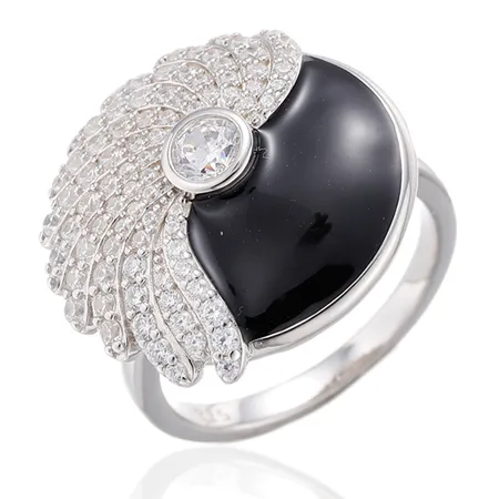 Black Enamel And Round White Cubic Zircon Rhodium Silver Ring