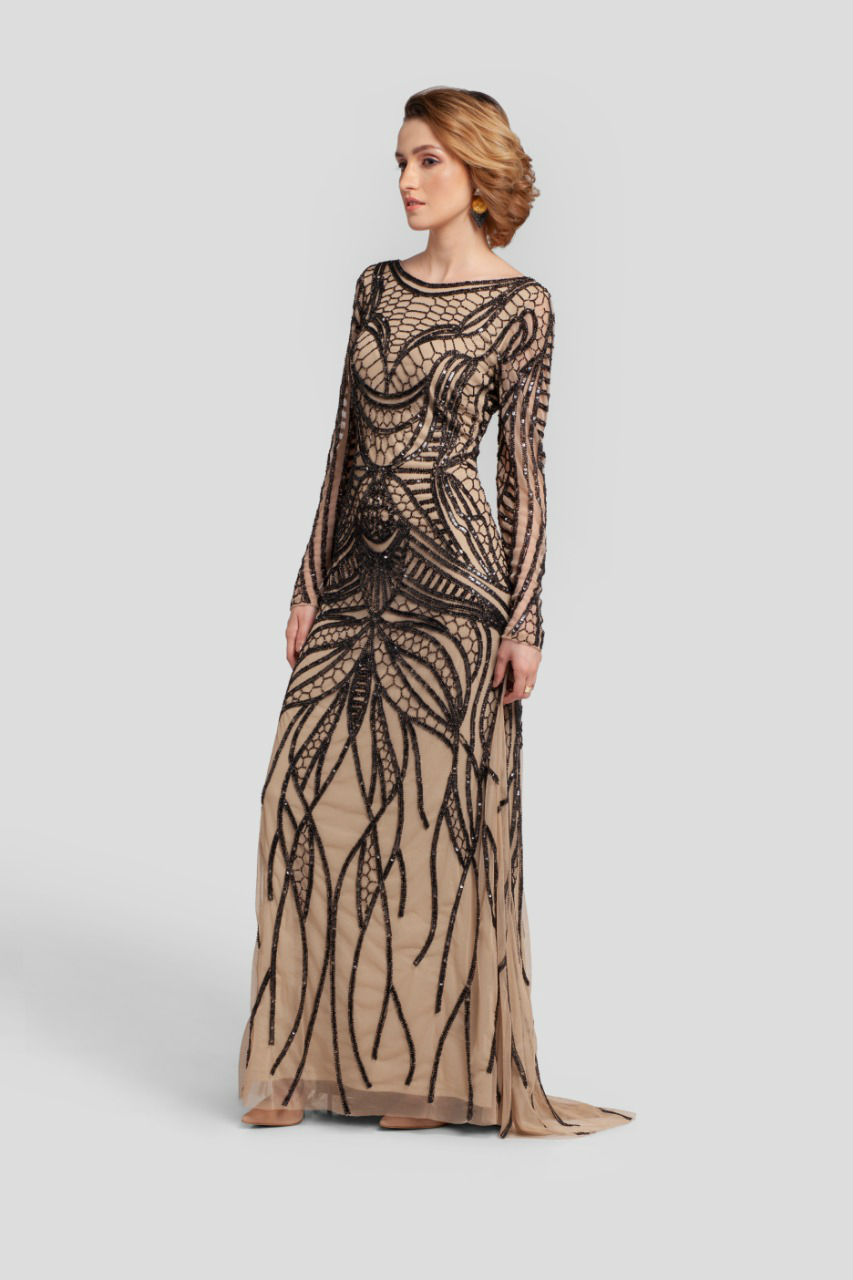• Black on nude gown with heavy work front and back, all done by hand. The cut of the dress gives an amazing look.