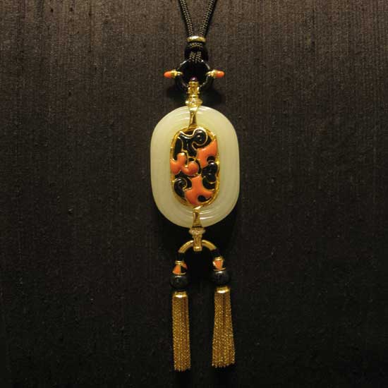 This black nephrite pendant features a fusion of eastern and western designs. The gold decoration brightens up your style. This black nephrite pendant makes an exceptional piece of jewelry for ladies.