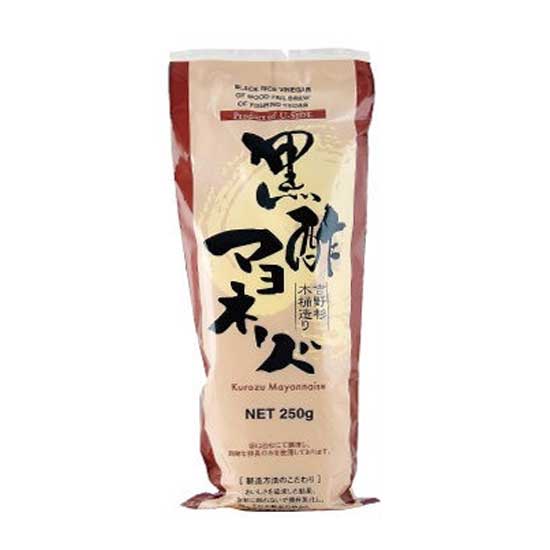 Displayed is a bottle of black vinegar mayonnaise. Made of high-quality ingredients, this mayonnaise offers a great taste. Season your dishes with this mayonnaise and enjoy.