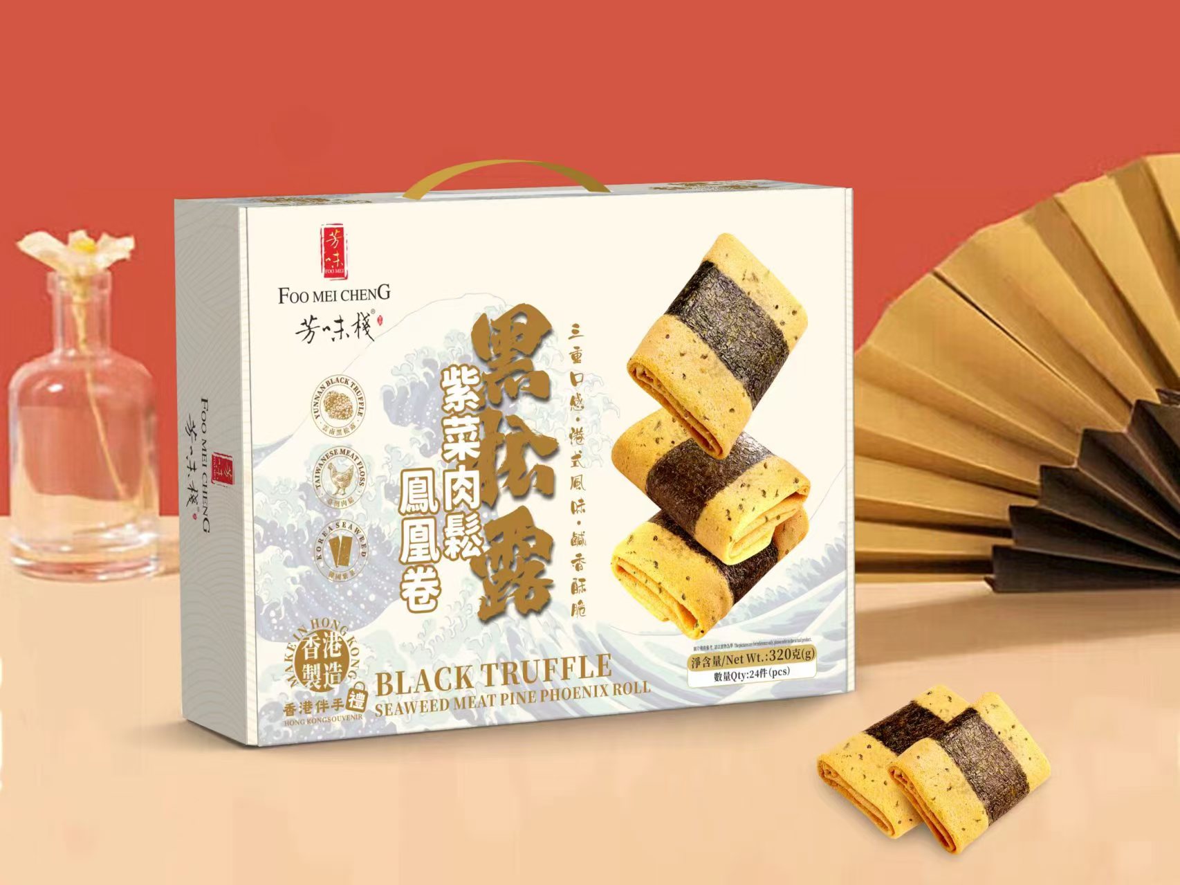 The black truffle seaweed phoenix roll is generally long or cylindrical in shape, with the egg roll skin rolled into a flat or tightly packed cylindrical form. The outermost layer is dark green seaweed, which is thin and crispy, wrapping the middle egg roll layer that presents an attractive golden yellow. Black truffle, on the other hand, is dotted on the surface of the seaweed or inlaid between the egg roll and the seaweed in small granular or flaky forms, enhancing the richness of the texture. It forms a striking contrast with the colors of the seaweed and egg roll, making it extremely appealing both visually and taste-wise. It can be enjoyed as a casual snack during work breaks, study sessions, or gatherings with friends. It not only satisfies cravings but also helps relieve fatigue.
