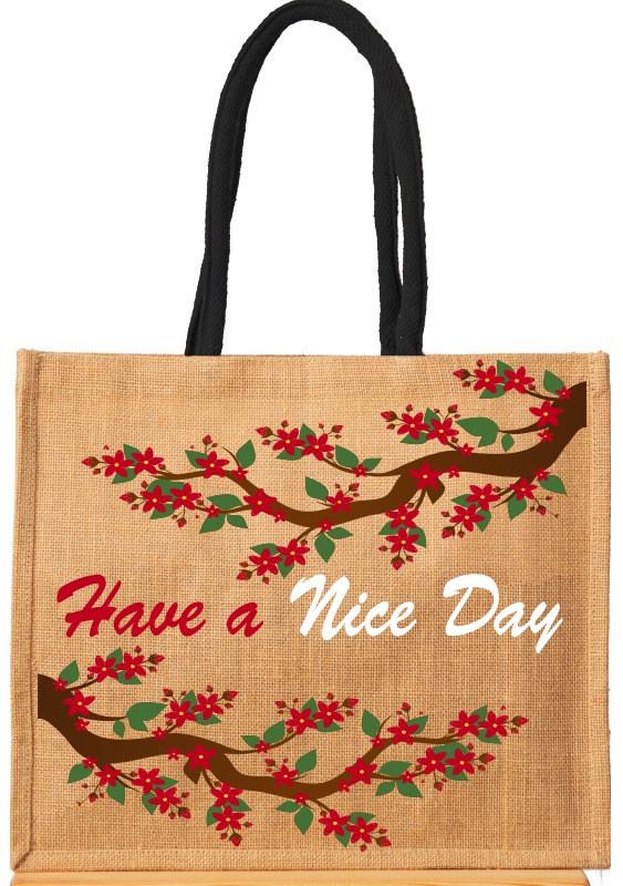 Natural Blossom Flower Jute Bag. Size: 32x34x20 cm / Handle: 40 cm Cotton Tape & Dori Webbed Handle. Print: One side Multicolor Print - Materials PP Natural Jute. Accessories