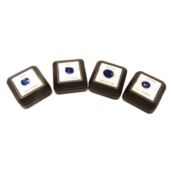 Pictured are high-quality sapphires from Ceylon (Sri Lanka). The natural sapphires display a serene and elegant royal blue. They are polished and faceted to show a variety of charm.