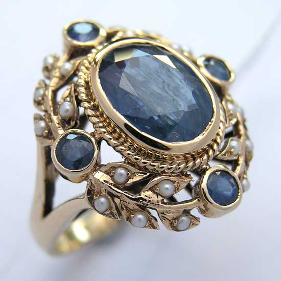 The blue sapphire ring showcases delicate cut-out details with exquisite craftsmanship. The seed pearl accents add glamorous beauty. Add impressive sparkle to your outfit with this antique-designed ring.
