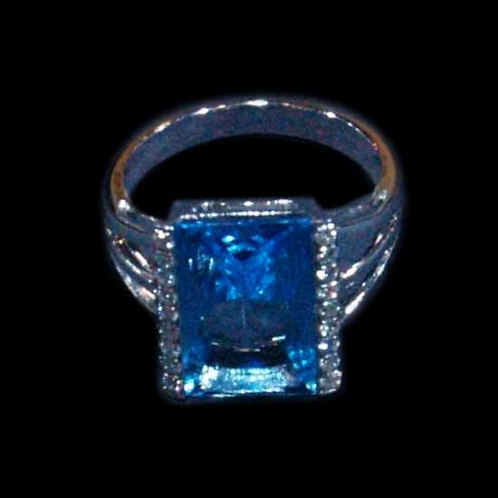 The blue topaz diamond ring boasts a white diamond setting to bring brilliant shimmer. The rectangular-cut blue topaz showcases dazzling luster. This blue topaz diamond ring is great for any special occasions.
