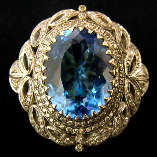 Featured here is a gorgeous topaz in an enchanting blue color. The gemstone is cut into an oval shape and set in a yellow gold and silver setting. The shiny setting is engraved with delicate patterns and paved with sparkling diamonds to exude a luxurious style.
