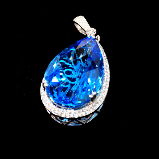 This gorgeous 18K white gold pendant is set with a stunning 49.65-carat blue topaz in pear shape. Embellished with glittering 0.83-carat diamonds, this blue topaz pendant reflects exceptional luster. This brilliant diamond pendant will surely steal the spotlight from the crowd.