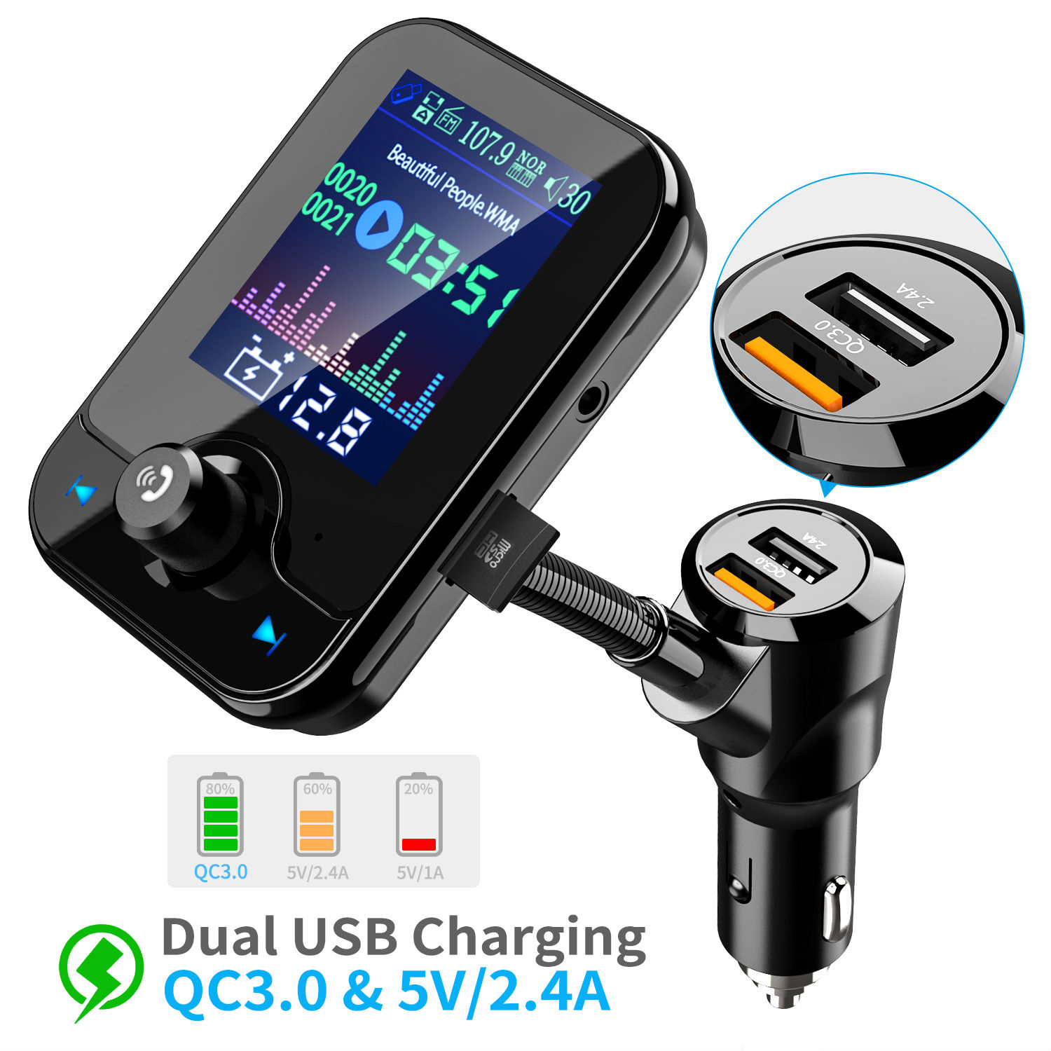 Large viewing angle 1.8 inch color screen display more information (caller number, song name, playback progress, car power voltage, etc.).