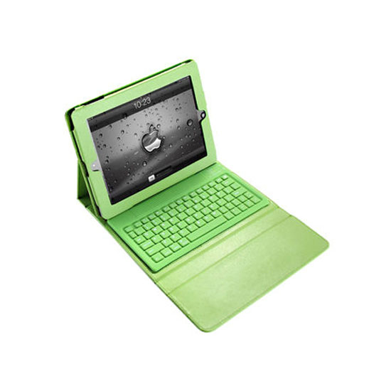 This is a Bluetooth keyboard with a case for added utility. It boasts a water-resistant and dust-resistant structure in bright green. This well-made keyboard is a practical accessory for iPads.