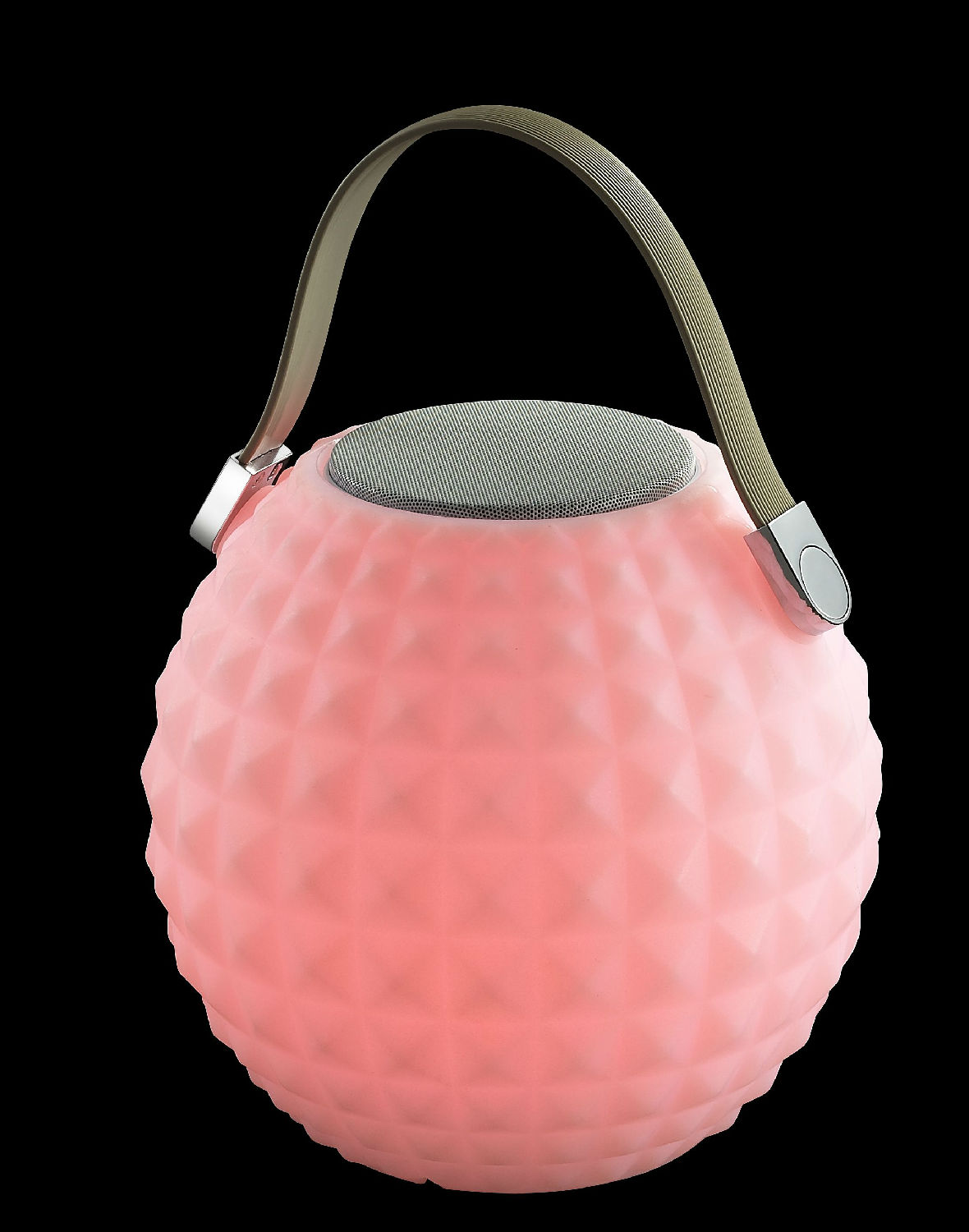 Product includes RGBW LED lighting and speaker. Play music by bluetooth from mobile unit, white color or multicolor sync to the beats of any song, these music lights are ideal for indoor and outdoor recreation. Products are made of high density polyethylene with IP44 certification. They don't have cables, so they're easy to carry anywhere; These lamps use rechargeable batteries for up to 6 hours. It is also equipped with a remote control device to control the lighting effect, color and sound effects from a long distance.