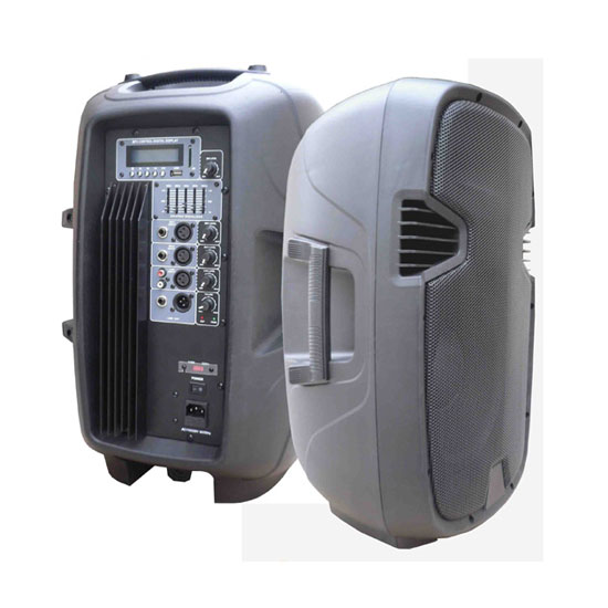 Displayed here is a speaker box with a plastic cabinet for a durable quality. It supports Bluetooth, MP3, 5-band EQ and echo functions. It also comes with an iPod connector, USB ports and SD card slots. This speaker box delivers good sound quality.