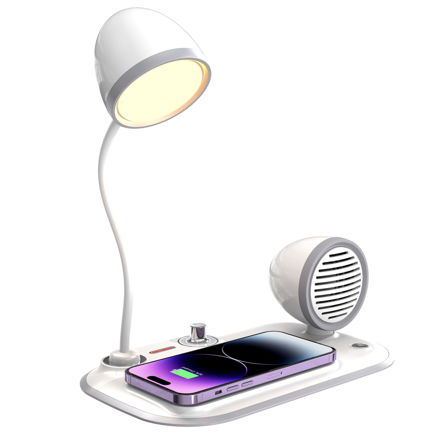 3 in 1 foldable desk lamp speaker wireless charger with flexible soft-tube lamp-post to change the lamp angle as you want .