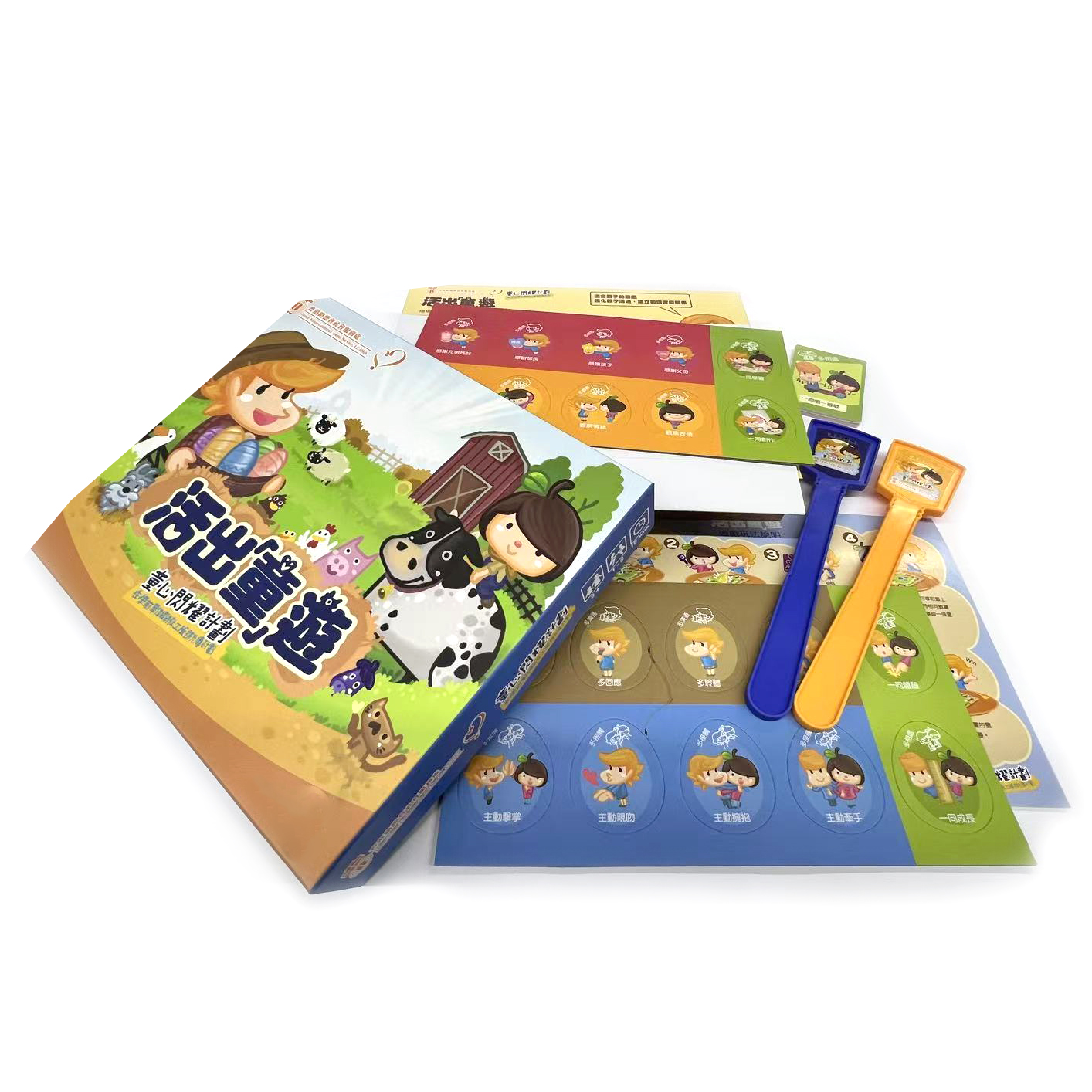 This preschool education board game set includes a cardboard lid & base box, courtesy education game board and plastic stand. It is safe, sturdy, educational and gift-grade — the ideal complete packaging solution for early childhood manners and social education toys.