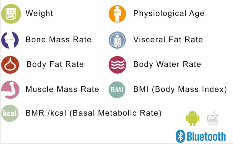 The body fat scales measure 9 parameters by BIA (Bioelectrical Impedance Analysis) principles – with Body weight / Body fat / Body water / BMI / Bone mass / Muscle mass / Visceral fat / Kcal (Basal Metabolic Rate)/ Physiological Age
