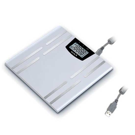 Displayed is a high-precision electronic body analyzer scale that is designed for home use. This high-quality electronic scale is also equipped to measure fat, muscle and bone range. This scale is an invaluable tool for athletes.