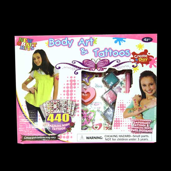 - Content: tattoos kit, stick body jewelry, body marker, stamps, ink pads.
