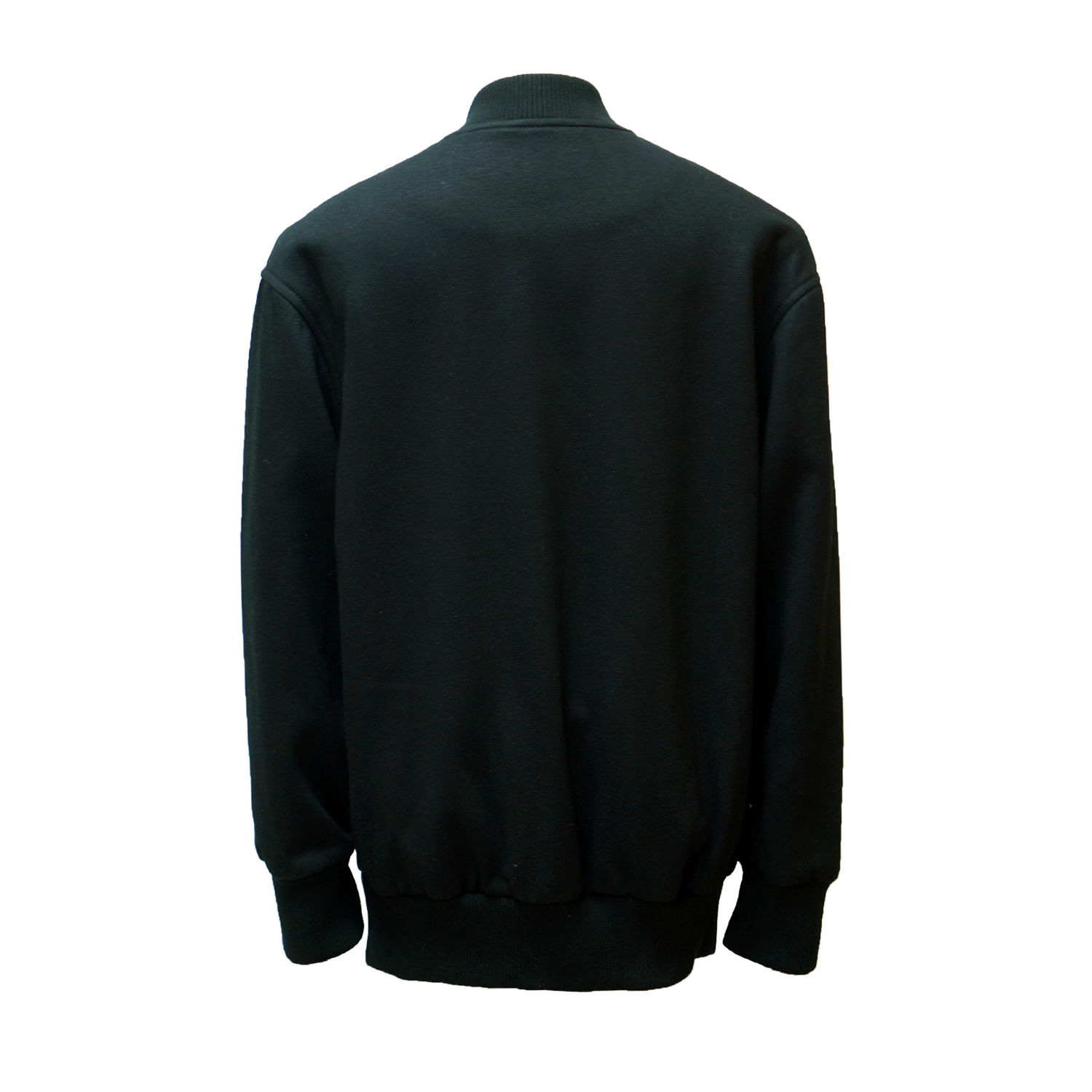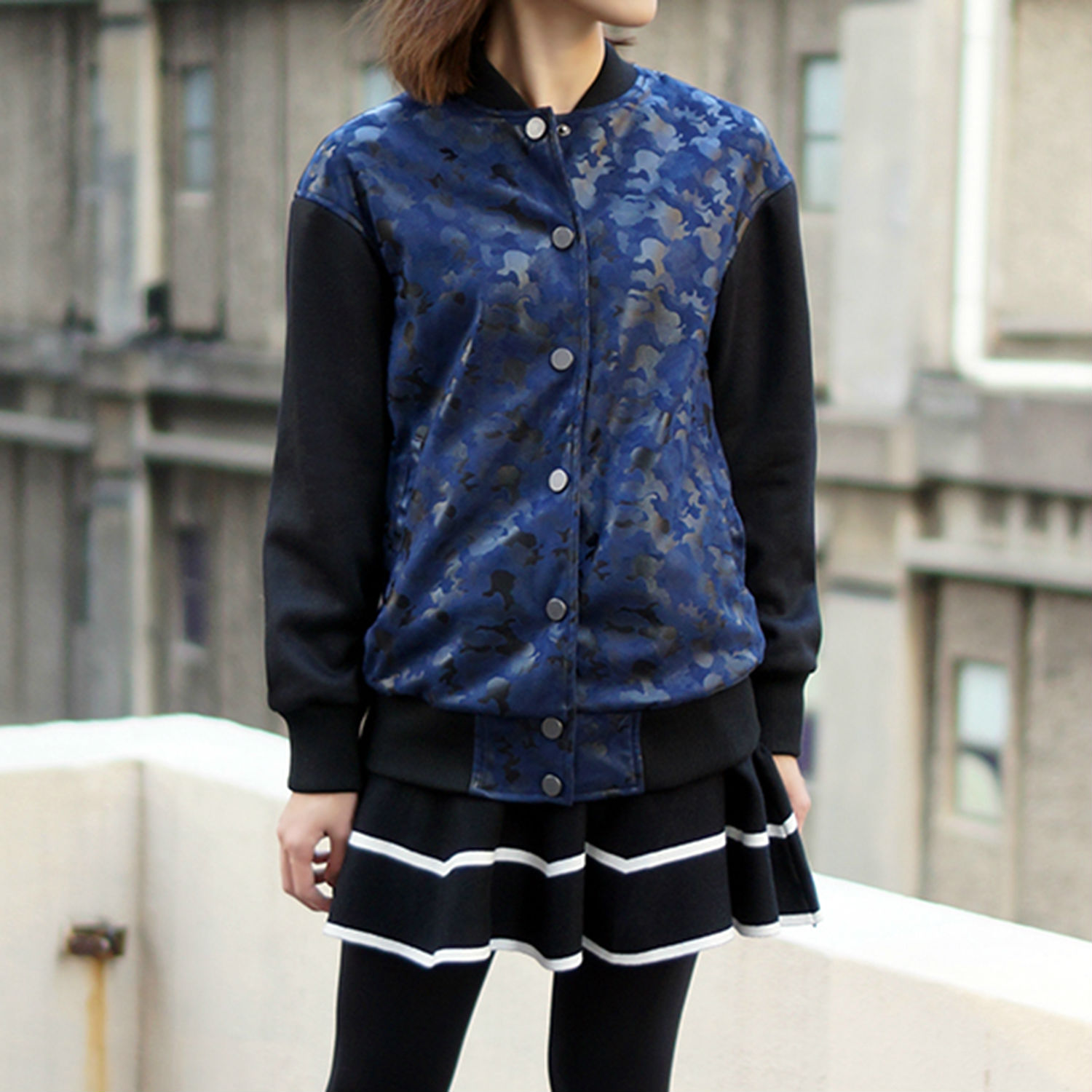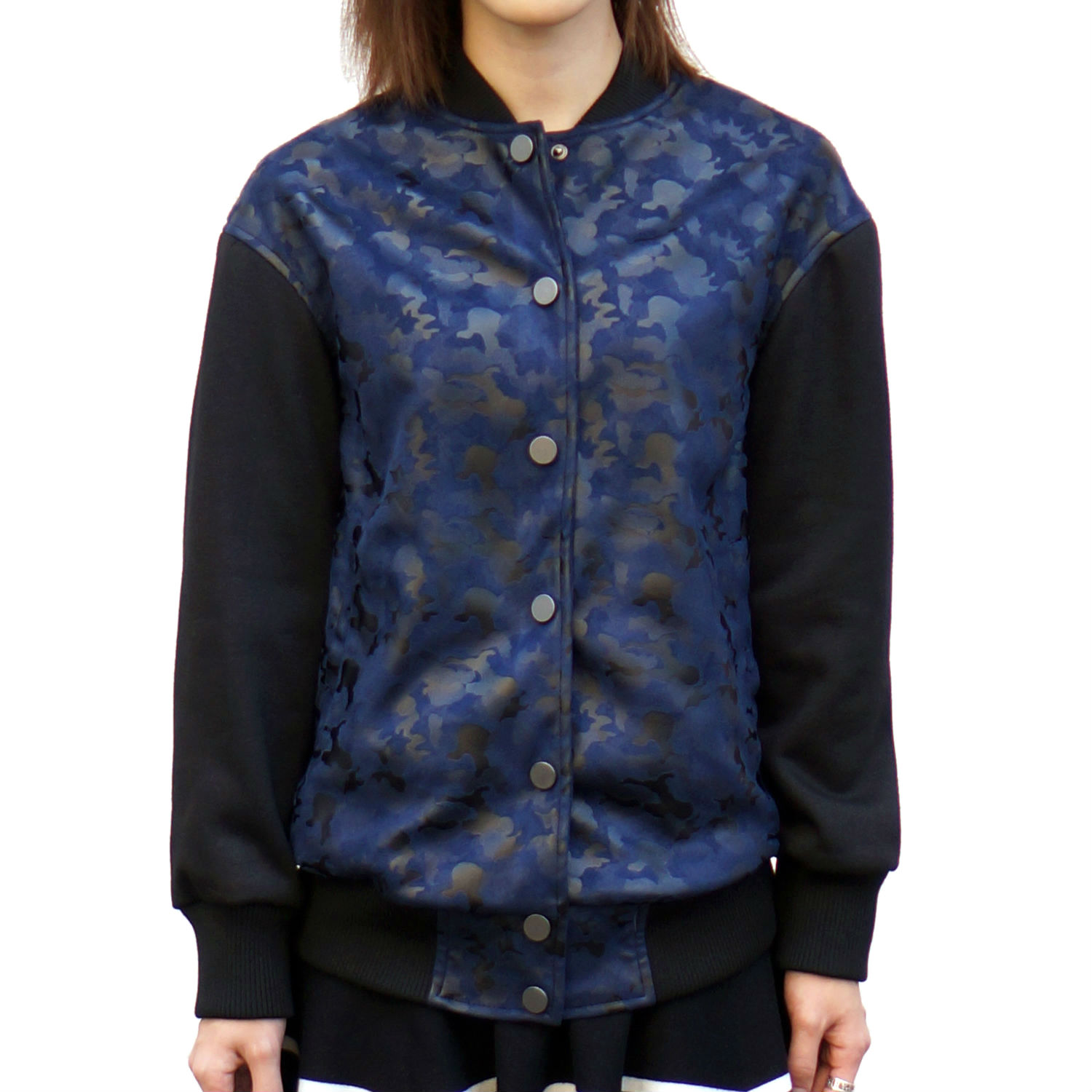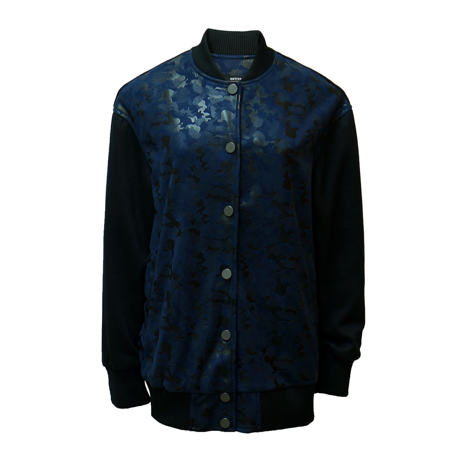 Long sleeve fleece bomber jacket in purple. Camouflage printing at front. Press-stud closure and welt pockets at front. Ribbed knit collar, sleeve cuffs, and hem. Fully lined. Tonal stitching.