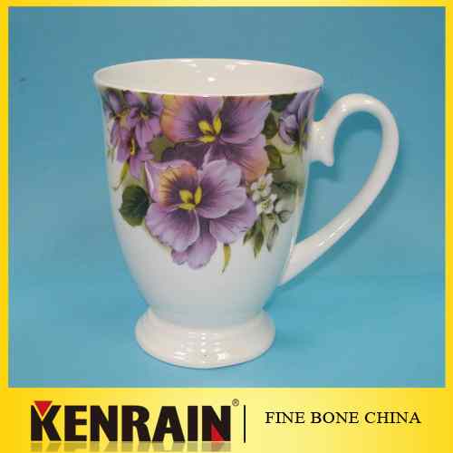 The featured drinking cup is made of high quality bone china that creates a slightly glossy finish. The cup is topped with a tinge of purplish flower for a vintage and poetic style.