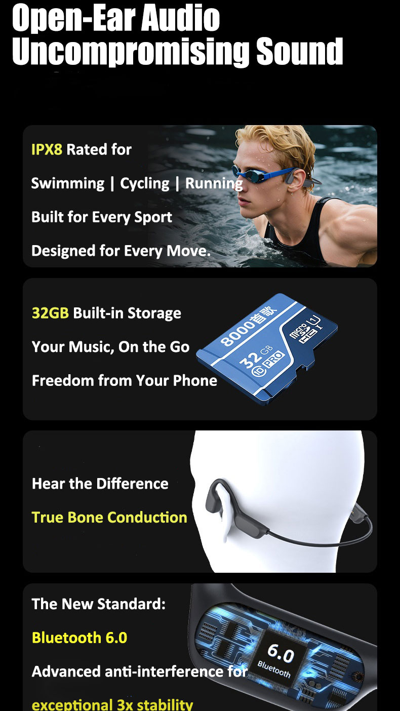 Step into true wireless freedom. With 32GB of built-in storage , you can leave your phone behind and dive into your music, podcasts, or audiobooks. Whether you're swimming laps 🏊 or hitting the trail 🏞️, your soundtrack is always with you.