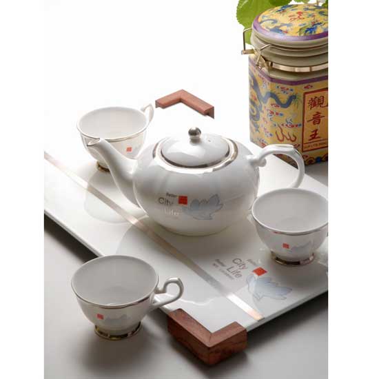 The displayed bone teaware set includes three teacups, a teapot and a tray. Each item in this set is finely crafted for a precise and thin structure. This elegant bone teaware set is a good idea to add a continental element to modern houses.