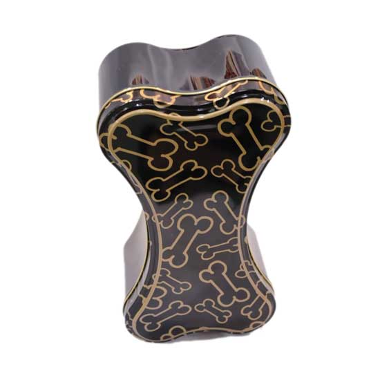 Showcased here is a tin box in an adorable dog bone shape. The lid of the black box is skillfully printed with gold-tone dog bone patterns to convey a sense of playfulness. This ingenious packaging box is an ideal gift for dog lovers.