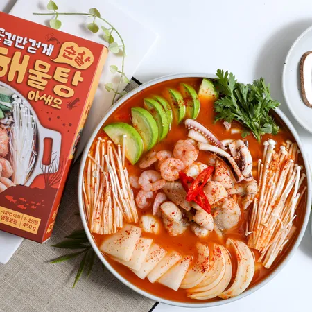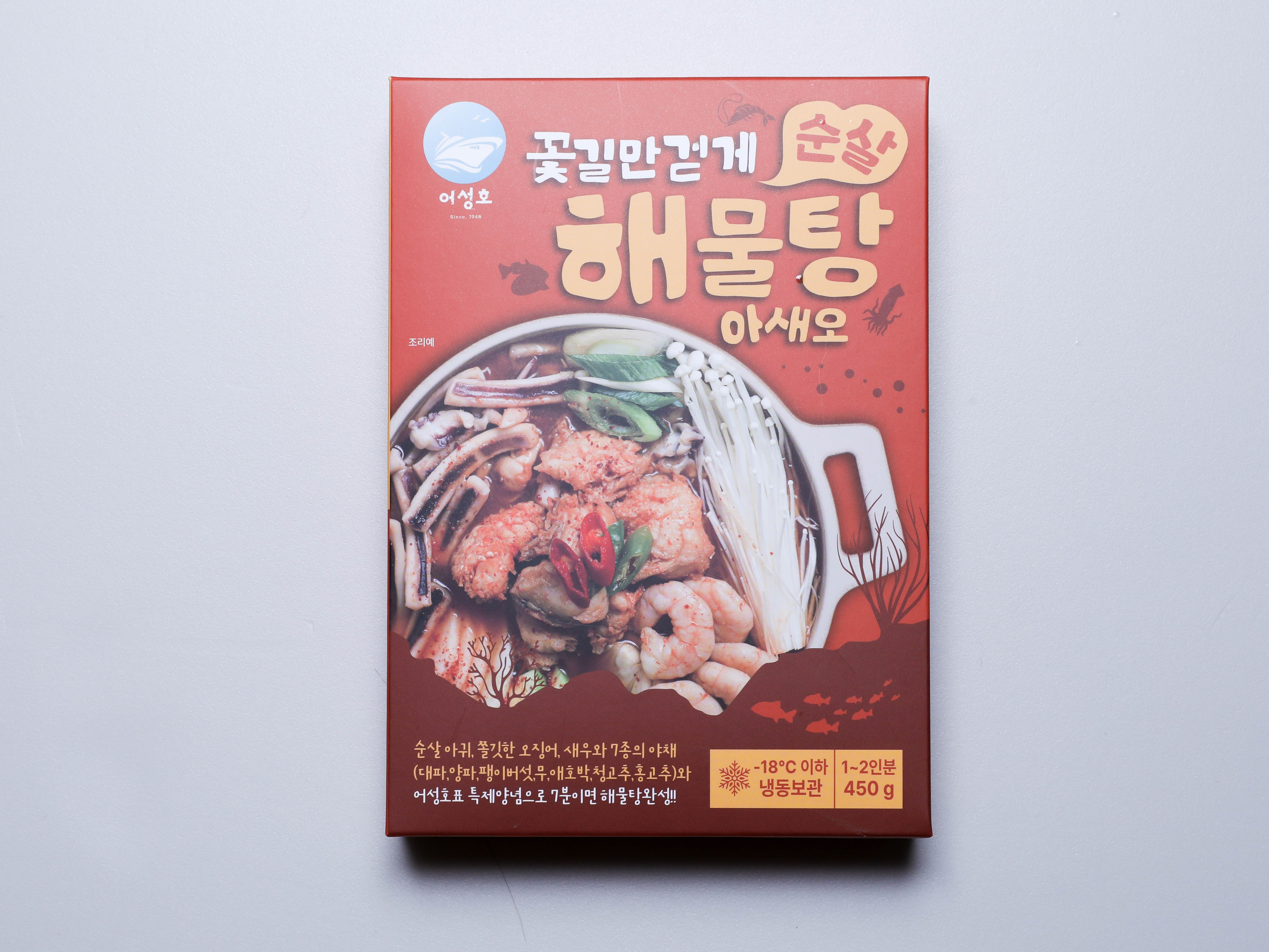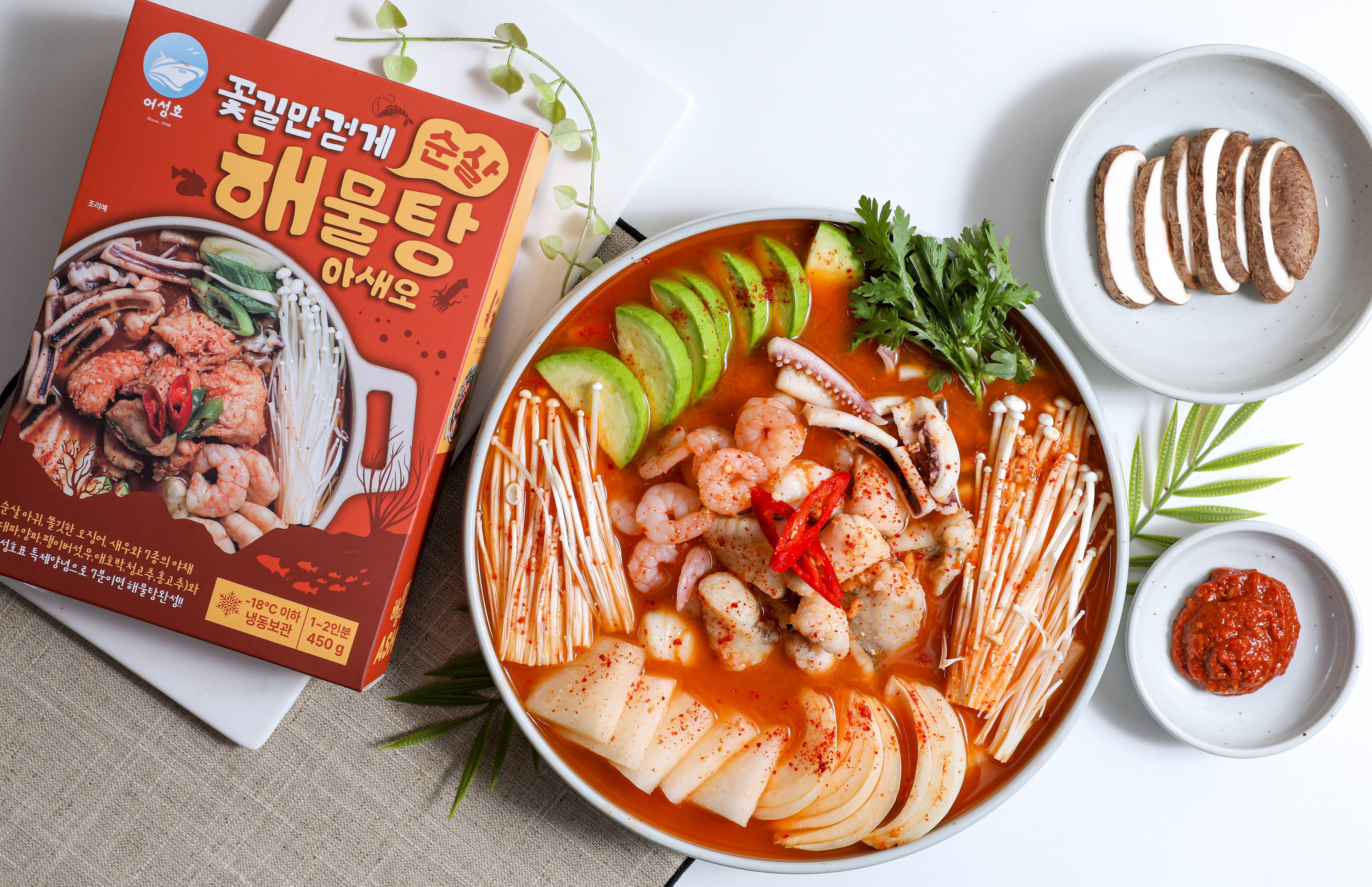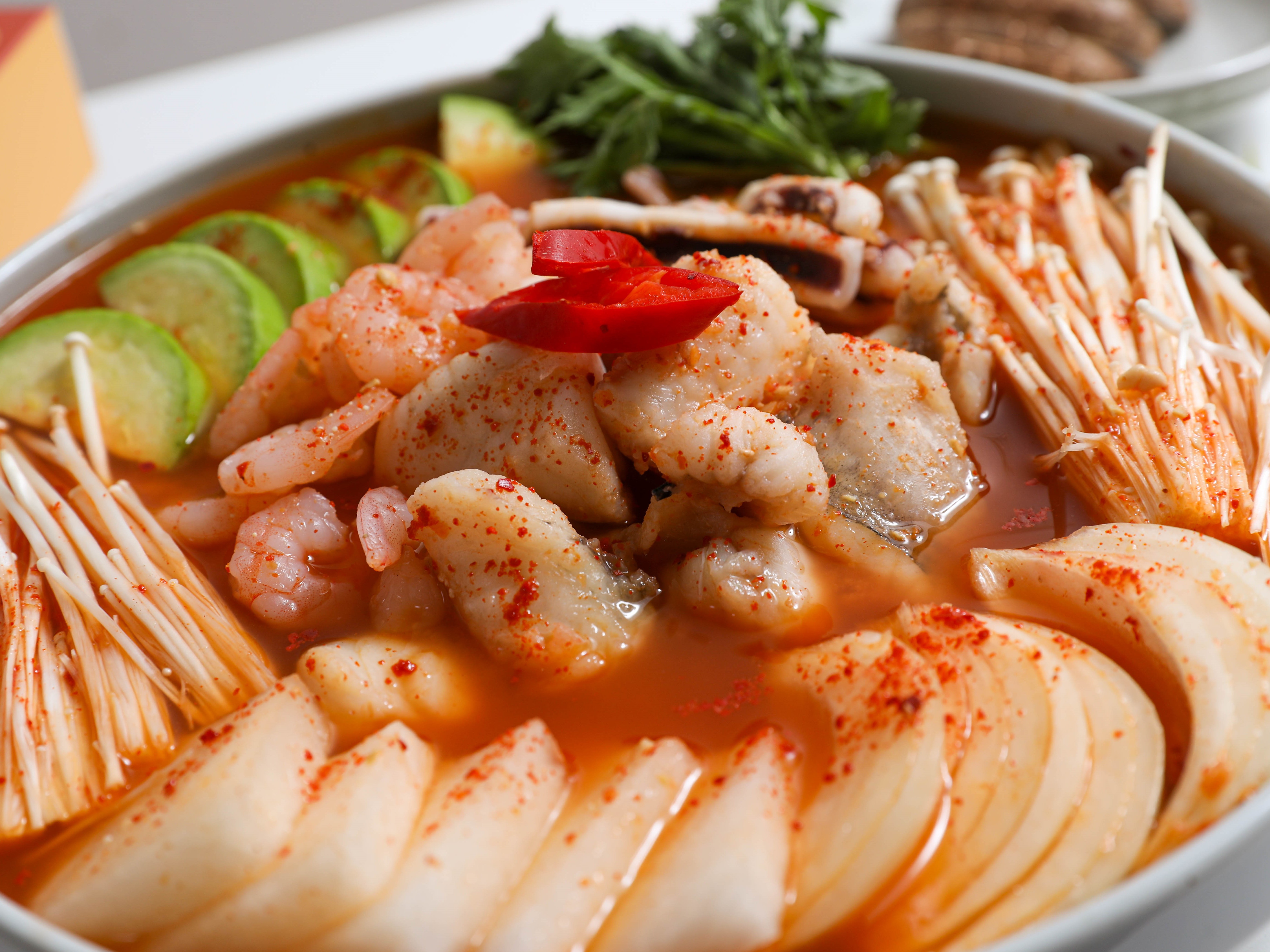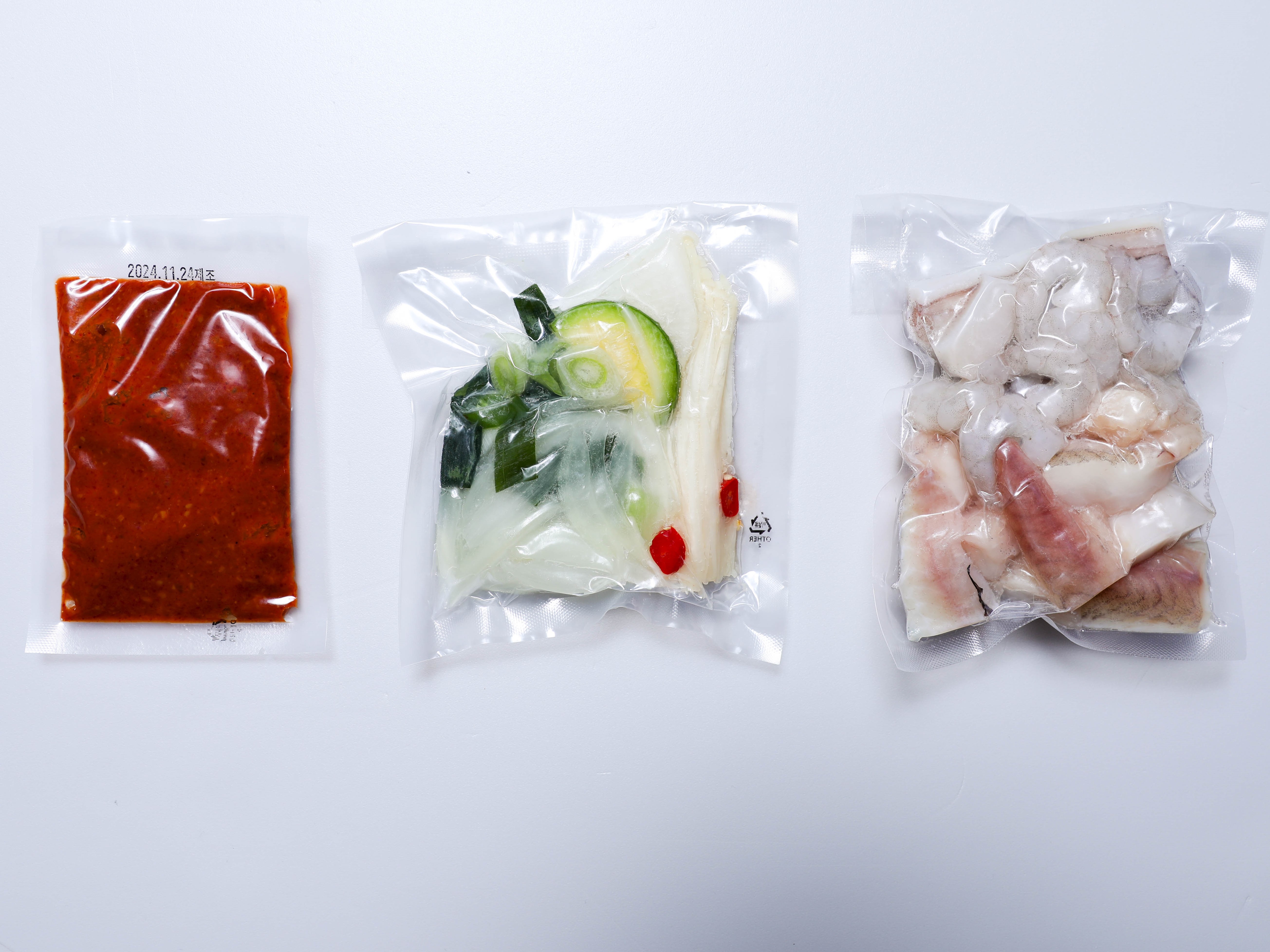 37.8% of domestic monkfish fillet, 11.1% of Vietnamese shrimp, 11.1% of ocean squid, 22.2% of domestic vegetables (mushroom & red pepper & onion & green onion & radish & zucchini), 17.8% of sauce (soybean paste, red pepper powder <50 domestic, 50 Chinese, Korean soy sauce, garlic, cooking wine, red pepper paste)